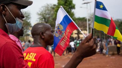 Lors d’un rassemblement de soutien à la Russie, à Bangui, le 5 mars 2022 . La proposition a les apparences…